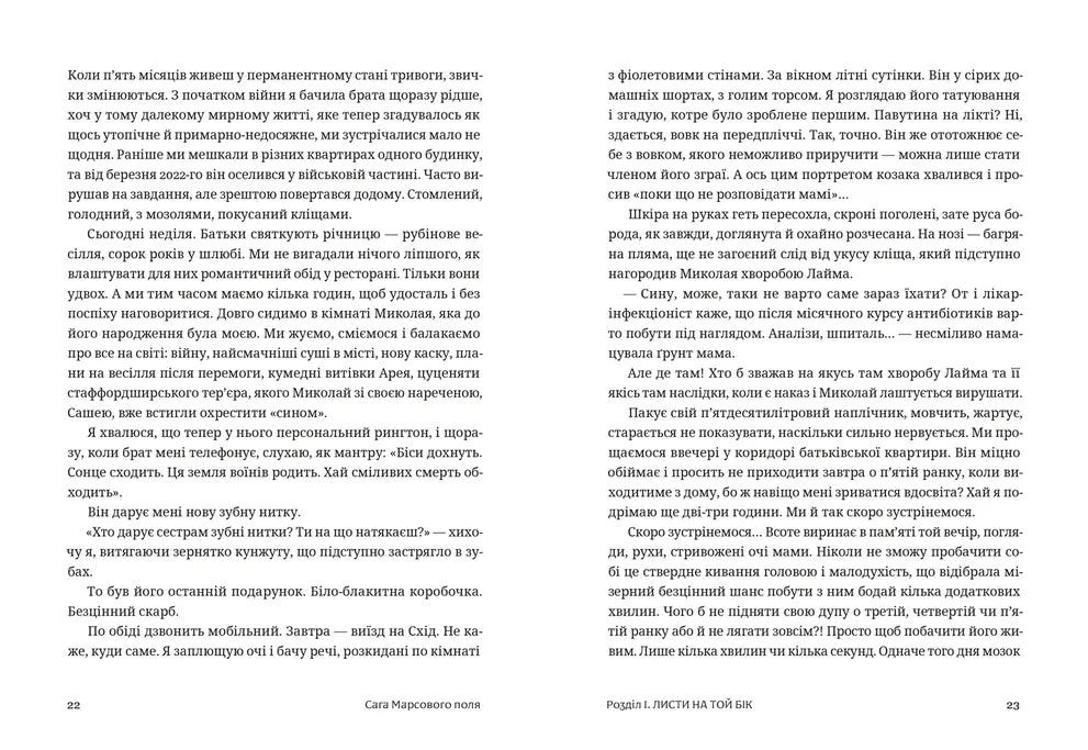 „Die Saga vom Marsfeld“ ist ein berührendes und aufrichtiges Buch der Autorin Veronika Karachevska, das von persönlichem Verlust, Schmerz und der unerschütterlichen Stärke des menschlichen Herzens erzählt. Ausgehend von ihren eigenen Erfahrungen erzählt die Autorin Geschichten von Menschen, die im Krieg geliebte Menschen verloren haben. Doch dieses Buch handelt nicht nur vom Verlust – es geht um Glauben, Genesung, Liebe und spirituelle Widerstandskraft.